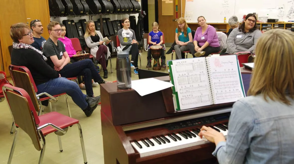 Community members gather at Cameron Heights Collegiate Institute to sing songs in a variety of languages: English, French, Spanish and Armenian, to name a few. (Melanie Ferrier/CBC)